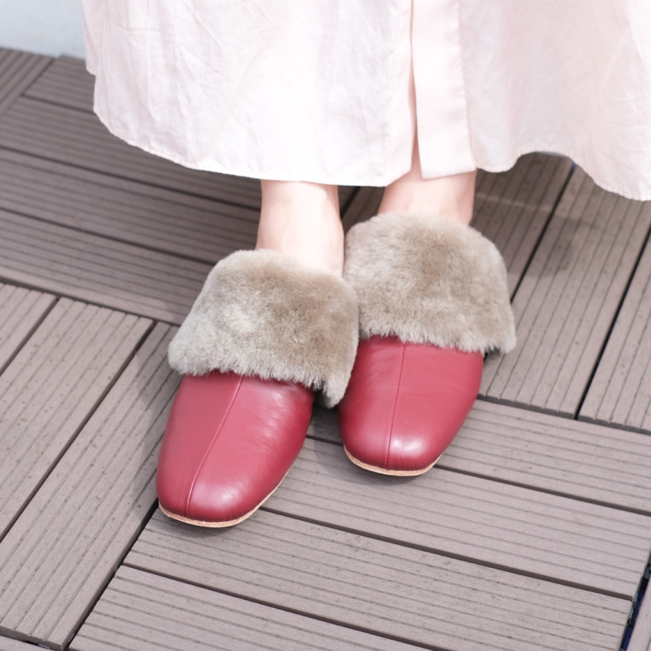 ムートンは天然素材のため調湿性がありベタつきを抑えて、さらっとした履き心地で過ごせます。ぜひ素足でお履きになってください。